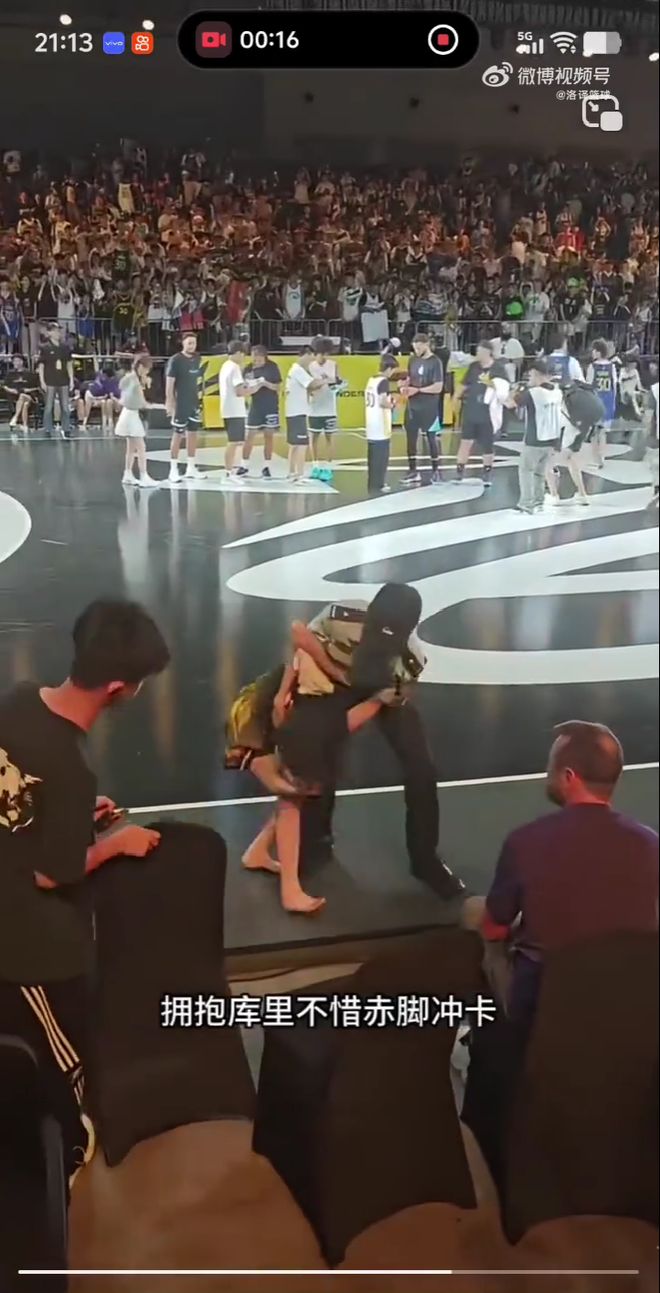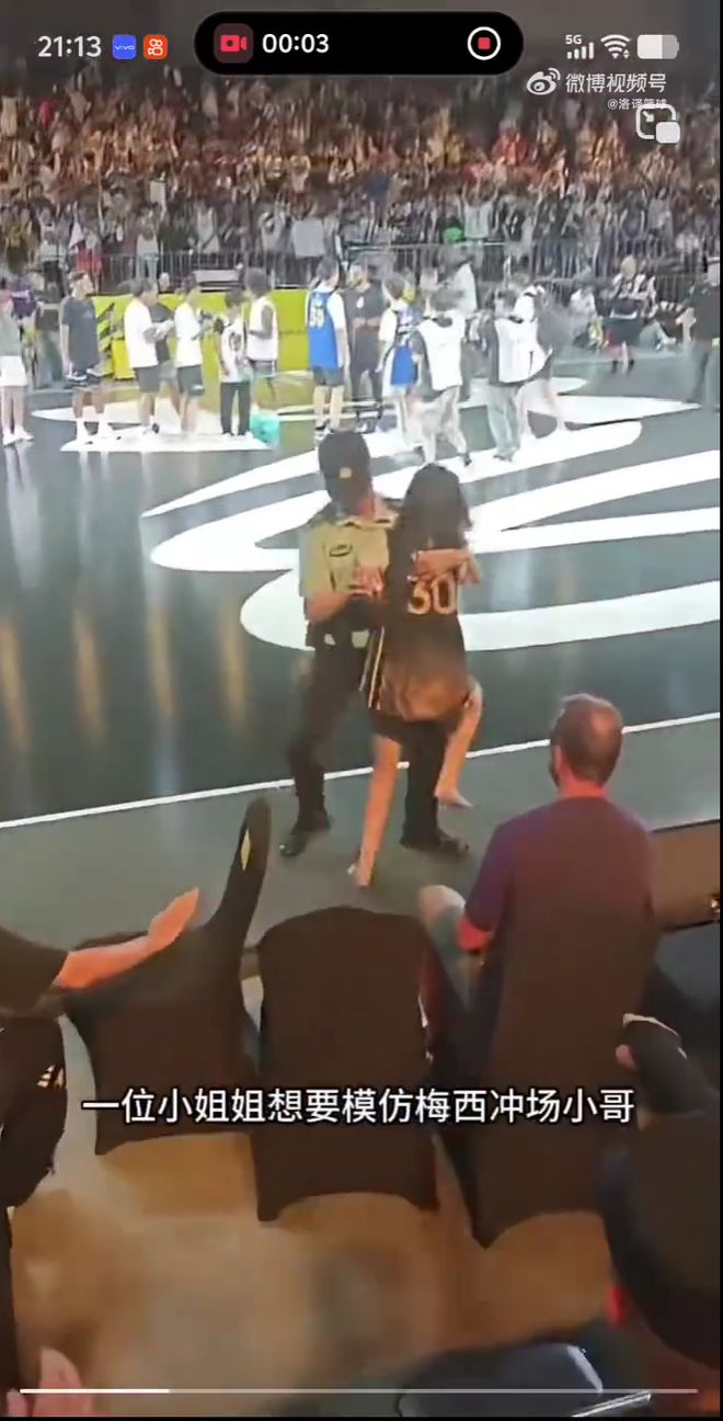 库里的到来也让现场的一位美女球迷彻底疯狂,她原本坐在第二排座位上围观,看到库里近在眼前,这位女球迷模仿了梅西冲场小哥的一幕,去场上拥抱偶像库里。