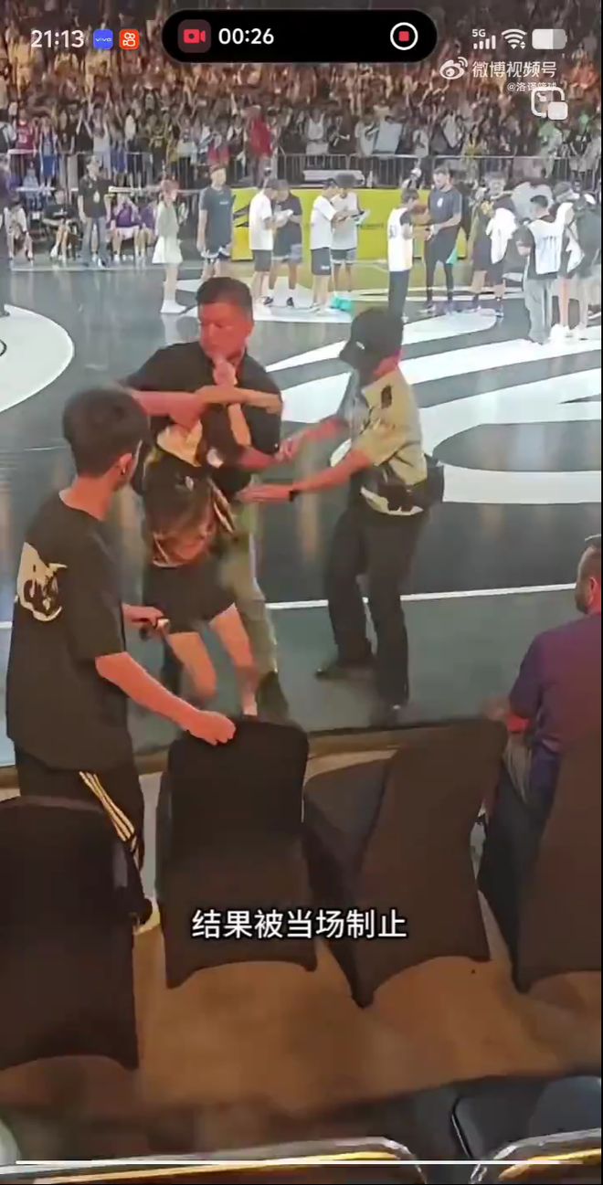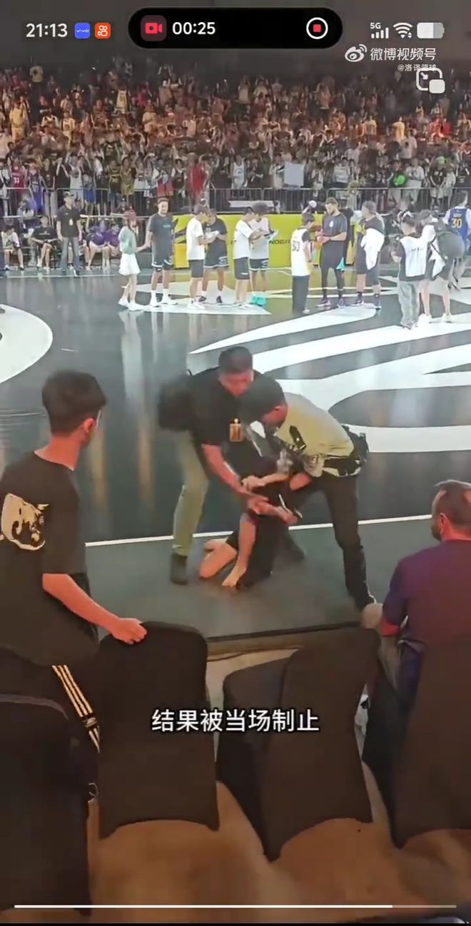 但是一名安保人员尽在咫尺,赶紧上前将她一把抱住,阻止她冲向场内。